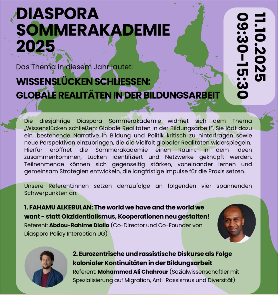 Die Diaspora Sommerakademie ist eine ganztägige Veranstaltung mit der wir Bildungsakteur:innen aus dem Globalen Süden bzw. diasporisch/migrantische Personen sowie BIPoC die Möglichkeit des gemeinsamen Austausches und der Diskussion bieten wollen. Bitte habt Verständnis dafür.
